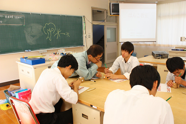 11月10日(火)ものづくりマイスター派遣事業「印章彫刻」を活用し、マイスターの国見さん、橋本さんをお迎えし、生活環境コースの3年生がはんこ教室を行いました。みんなが熱心にはんこづくりに取り組み、それぞれが記念に残る立派なハンコを完成させることができました。講師の先生ありがとうございました。