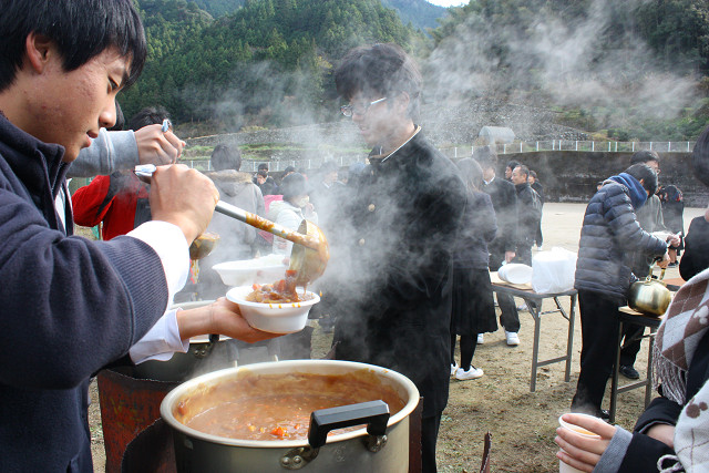 12月17日(木)全校生徒と地域の方々と合同で防災訓練を行いました。この取り組みは災害時には地域と学校などの協力が大切になることから、学校のある上八川地域の方々とともに吾北総合支所住民福祉課、仁淀消防組合吾北分署の協力のもと消火訓練や簡易担架での搬送訓練、炊き出し作業等を実施ました。訓練だけでなく地域と方との交流ができ、生徒も地域の方々が気持ちで繋がることができた実りある時間となりました。また、みんなで食べたカレーライスの味は忘れることのできないものになったと思います。お世話になったみなさん、ありがとうございました。