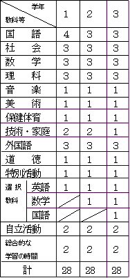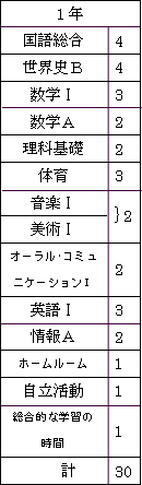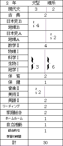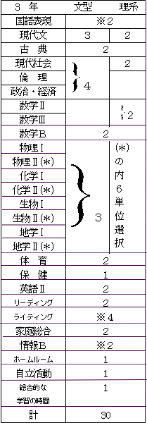 注)選択科目について @芸術科目については、1年次に音楽T又は美術Tのいずれか1科目を選択履修し、2年次に同じ科目のUを継続履修するものとする。 A3年次は※の内、文型は4単位、理型は2単位選択する。 文型において3年次に理科科目Uを履修する者は、2年次に同じ科目のTを履修しなければならない。理型においては、2年次に理科Tを2科目履修し、3年次にはそれぞれ履修した科目のUを継続履修するものとする。 |