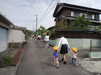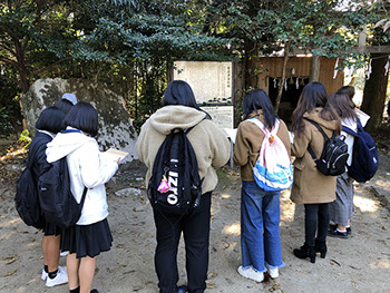 入野の浜をスタートし、加茂神社、あかつき館、津波避難タワーの順でフィールドワークを行いました。説明は本校の生徒が英語で行いました。各場所に移動し、それぞれの場所で写真を見せながら行う生徒の説明を、留学生たちは熱心に聞いていました。また、ツアーの道中でも、日常生活やお互いの国のことなどを尋ねあい、積極的にコミュニケーションをとる姿が見られました。