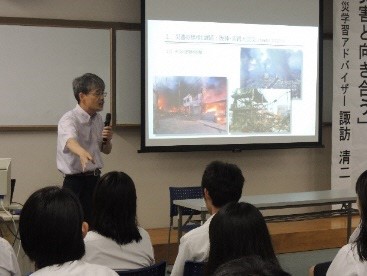 7月4日(水)に、日本で初めて防災学科を設置した兵庫県の舞子高校の元教諭で、防災学習アドバイザーの諏訪清二先生による講演が行われました。東日本大震災で被災された方々の生の声や当時の避難所の様子、大災害から立ち上がった人々の活動などについて話してくださいました。生徒からは、「今日習ったことはこれから、大方高校の生徒が向き合わなければならないこと、だから今日学んだことを防災教育に生かしていきたい。」などの決意が表明されました。