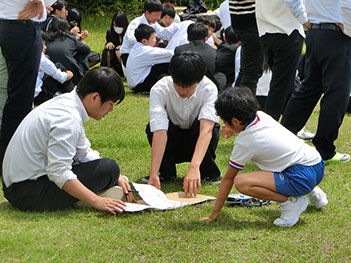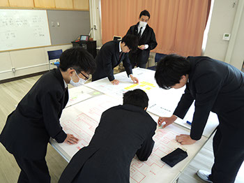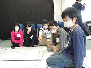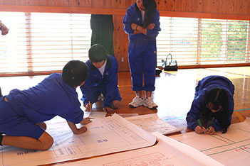 2年生は入野小学校の6年生と一緒に実践しました。小学生からは「最初は難しかったけどだんだん楽しくなった」「またやってみたい」という感想をいただきました。高校2年生からは「小学生が一生懸命考えて意見を出してくれたから、こちらも真剣に考えることができた」という意見が聞かれました。高校生にとっても、小学生の素直な意見はとても良い勉強になりました。これからも、地域で一緒に学び、防災活動をしていきたいと考えています。