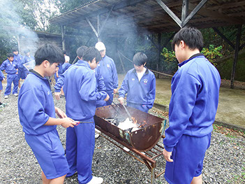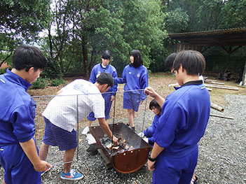 11月13日(火)に、入野の浜からの避難訓練の後、全校生徒・教職員で炊き出し訓練を行いました。お昼ご飯確保のためにカレーは準備しましたが、あとは、基本的に家庭にあった食材を持ち寄って調理しました。学校にある半分に切ったドラム缶や即席のかまどを用いてバーベキューをする班や、持ち寄った食材で鍋料理をする班、竹筒でご飯を炊く班など、各班工夫して取り組んでいました。持ち寄ったため野菜ばかりのバーベキューとなる班もありましたが、楽しく過ごせました。その後、実際に被災した時の事を考えて振り返りを行い、防災意識を高めることができました。