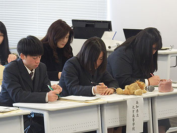 3日に行われた生徒交流では、本校の2年生が地域の方の協力を得ながら作成している「大方高校オリジナルHUG」の取組や、防災に関する学校行事、学校設定科目における「地域学」での防災学習等について紹介しました。その後、被災体験のある菅原さん、笹さんから、避難所での様子や課題と感じたことやオリジナルHUGへの意見等をいただきました。また、今泉先生からも、当時のお話などをお聞きし、今後の学習に生かせるたくさんの情報を得ることができ、有意義な時間となりました。