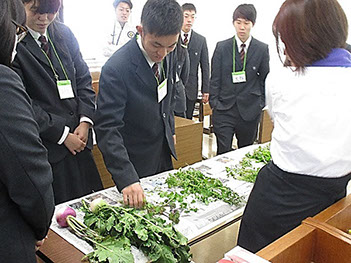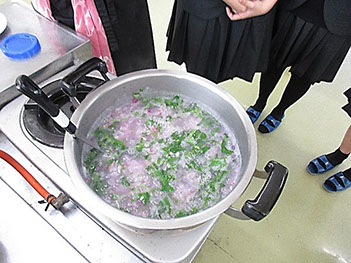 生徒たちは、学校の敷地内を散策しながら斎藤さんの説明を聞き植物を採取。調理室で調理し試食しました。