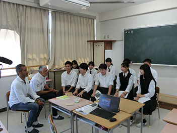 学校長の挨拶の後、本校の防災教育の取組について浦田教諭から紹介を行い、質疑応答を行いました。研修員の皆さんはその後、1年生の防災LH「備蓄している「非常袋」の中身について考える」ワークショップを参観しました。研修員の皆さんは、作業をしている生徒たちにいろいろと声をかけ、質問をしていました。