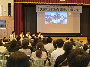 11月2日(土)に開催された、「第5回黒潮町地区防災計画シンポジウム ~我がこととして感じる手づくりの防災計画~」 において、地域学を専攻している生徒たちがこれまでの取組を黒潮町の皆さんに報告しました。