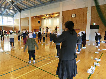 その他に、避難所での一人当たりのスペースを理解してもらうために、新聞紙を広げて広さを感じてもらう体験や、その場でできる体操なども一緒に行いました。