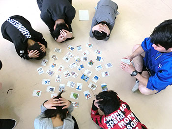 最初は児童の扱いに戸惑っていた生徒たちも時間と共に徐々に慣れてきて、かるたのルールとして、読み札を読むときはダンゴムシのポーズで待つ!を決めていましたが、それができていない児童や、こっそり覗き見をしている児童に「ルールが守れてないと読まないよ!」などと言ってコントロールをしていました。