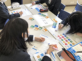 そのあと大方高校の防災教育やクリエコといった活動が、SDGsの17の目標のどこに当てはまるのか考え、グループで話し合いました。また、前日に企業見学にお伺いした、「足摺海洋館SATOUMI」と「土佐清水キャンプフィールド」のスノーピークがどのような役割や活動を行っているか、SDGsの視点から考えて意見交換をしました。