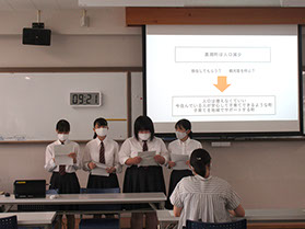 この1年間、総合的な探究の時間において黒潮町の総合戦略アクションプランを 読み込み、関係機関にインタビューを行い、黒潮町の課題を見つけ、課題に対す る解決策を自分たちで考えてきました。その取り組みをグループごとに分かれて 発表を行いました。また、その様子はオンラインでも配信しました。