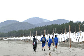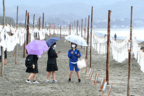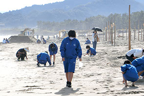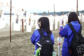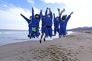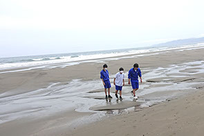 目的は、まず地域のイベントを体験すること。はじめての生徒も多く、砂浜にTシャツ並んだ風景を楽しんでいました。