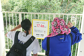 津波避難タワーの見学では実際にタワーに上り、タワーへの避難を疑似体験しました。