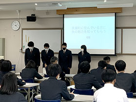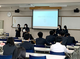 12月7日(火)、3年生が取り組んでいる「食品ロス削減に向けた解決策」のアイデアを社会人の方に発表しアドバイスをいただきました。