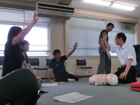 午後は救急法の研修が行われていました。みんな積極的に手をあげ