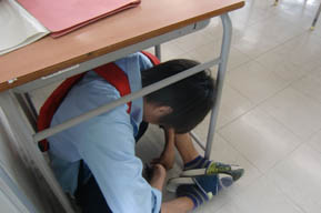 地震が発生したら、机の下などに隠れて落下物から身を守りましょう。