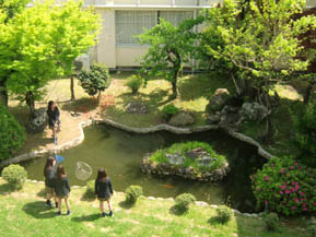 4人組が網を持ち出して、池に落ちた葉っぱをすくっていました。