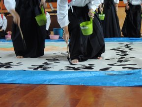 大方高校の体育館で中村高校の書道部がパフォーマンス中。