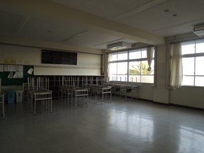 教室はキレイに掃除されて、机も後ろに下げられていました。