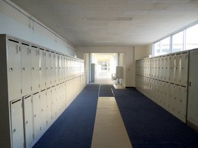 生徒玄関耐震工事のためロッカーは保健室前に移動しました。