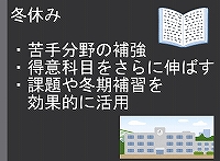 | 12月18日(木)2学期終業式を行いました。1,2年生でインフルエンザ感染による欠席生徒がとても多く、受験を控えた3年生への影響も考えてリモートで2学期終業式を行いました。校長先生から2学期間の総括と共通テストを目前に控えた3年生へのエールが送られました。その後、教務部、進路指導部、生徒指導部から冬休みの過ごし方や、心構えについてお話がありました。 | |||||