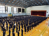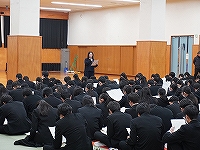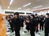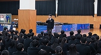 | 1月8日(木)大学入学共通テスト激励会を行いました。初めに校長先生から激励の言葉があり、そのあと生徒を代表して3年5H 植村 英太 君が、「テスト本番はネガティブな感情は捨て、自分のやってきたことを信じましょう。今の自分にできる最大限の力をだしきり、共通テストが終わった後『やりきった』と思えるよう全力を尽くしましょう。」と、共に頑張ってきた仲間たちにエールを贈りました。 | |||||