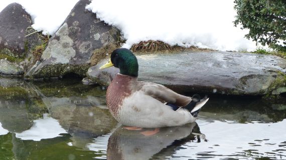 佐高のマスコットで、池の主でもあるマガモの