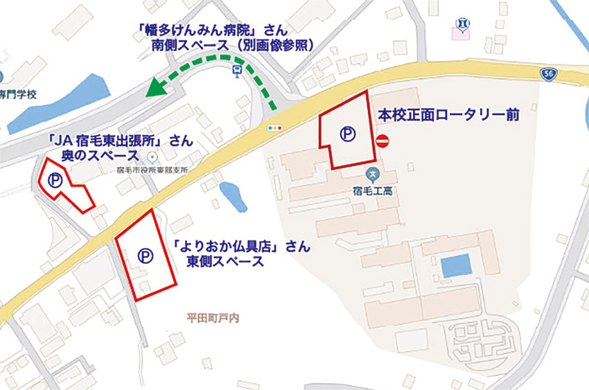 文化祭開催時(11/29)の駐車場についてお知らせです。 校内の駐車場は「正面玄関前ロータリー付近」となります。 他に校外の「よりおか仏具店東隣りの空きスペース」、「JA宿毛東出張所・奥のスペース」、「幡多けんみん病院」駐車場の学校寄り付近も、ご厚意で駐車場をお借りしています。 以上の場所に駐車するようお願いいたします。近隣への迷惑となりますので、学校前のローソンや民家、路上駐車等は絶対にしないように、ご協力をお願いいたします。 なお、駐車中は車の中に貴重品を置かないようにしてください。また、車の施錠を忘れずにお願いいたします。 ■画像をクリックすると拡大して表示されます。 |