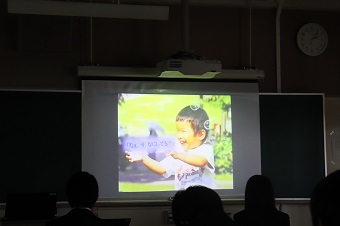 本校スクールカウンセラーの池田先生とスクールソーシャルワーカーの西森先生から本校1年生対象に「自分のいいところを探してみよう」というタイトルの授業を行っていただきました。