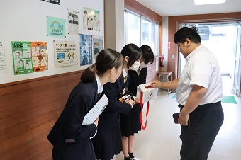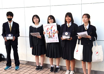 この日は朝から暑い日差しが照り付けましたが、部員たちはそれぞれ自転車ヘルメットを被り交差点に立ち、地元の皆さんに挨拶しながら自転車ヘルメット着用を呼びかけました。