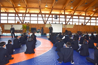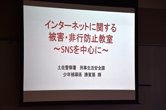 1.2年生対象に非行防止教室を行いました。今回は土佐警察署の勝賀瀬様からSNSやインターネットの危険性と事件や事故に巻き込まれないための心構えについて講演していただきました。