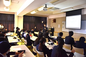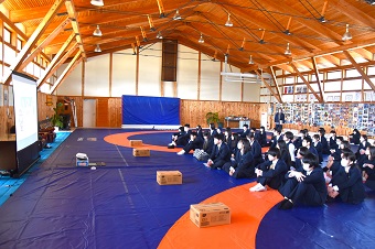まず、全校生徒で学校紹介動画を視聴し、高岡高校の沿革や歴史、校訓や様々な活動について説明を受けました。
