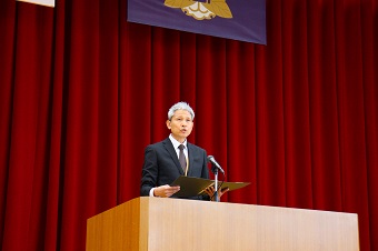 次に村田冬真生徒会長が「わからないことや困ったことがあったらすぐに先輩たちに相談してほしい」「皆さんの熱意・創意・誠意に期待します」「ご入学本当におめでとうございました」とお祝いの言葉を述べました。