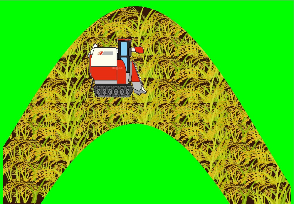○コンバインに指をおいて左右に動かすことで稲が刈り取られて、田んぼが現れる
