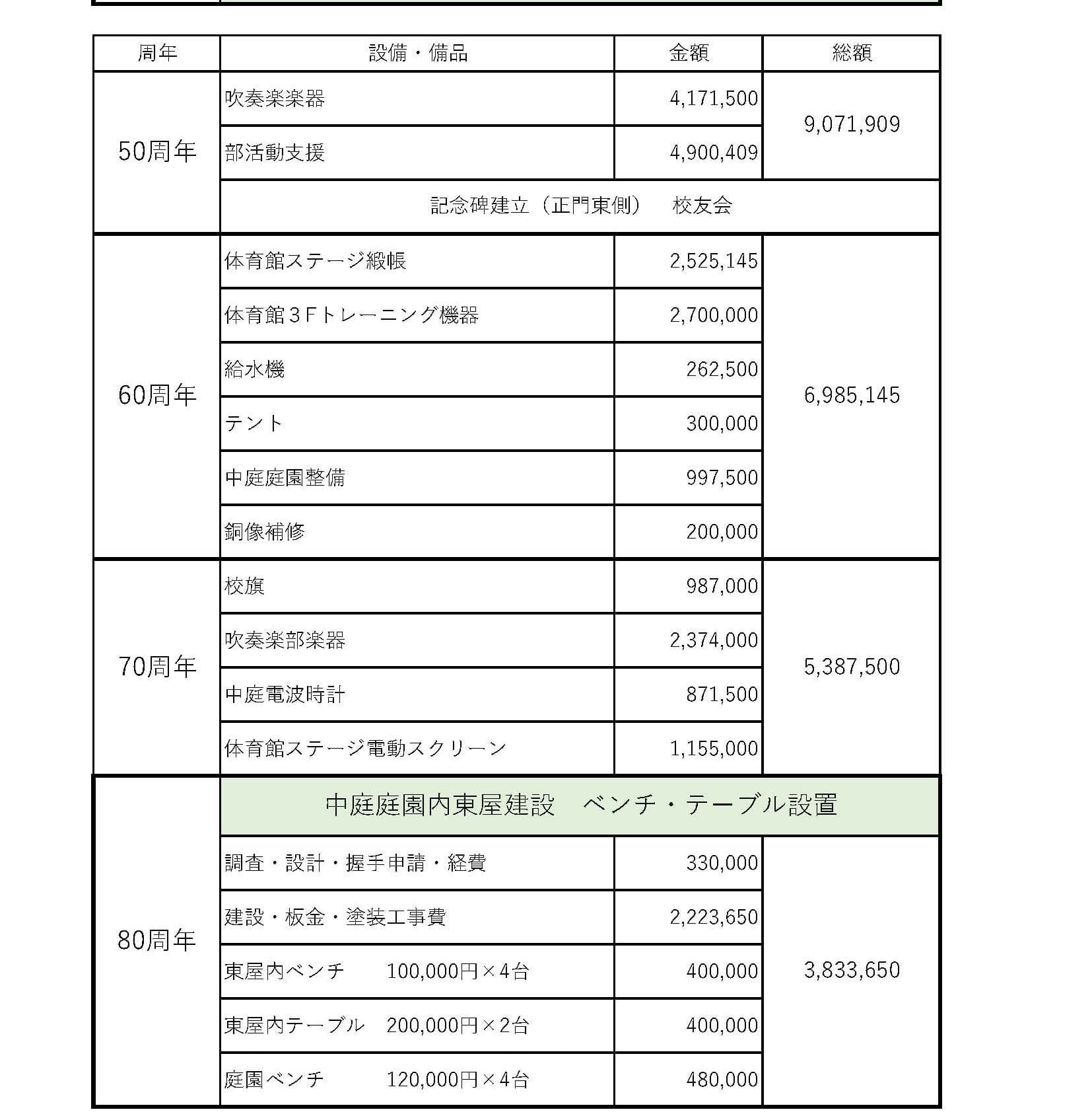 創立40周年から始まった周年事業により、10年に一度学校施設の整備や備品購入等を行い、教育委環境の整備を行って参りました。今回の創立80周年記念事業では中庭庭園内に約12畳の東屋の建設とテーブル2台とベンチ8台の設置を計画しております。