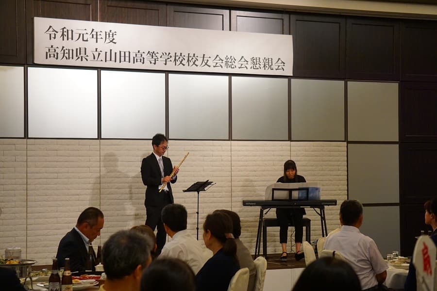 総会終了後の懇親会のオープニングでは服部牧人さん(S62年度卒)と父田由美さん(山田高校教諭)によるフルートとピアノの演奏があり、皆聞き入っていました。
