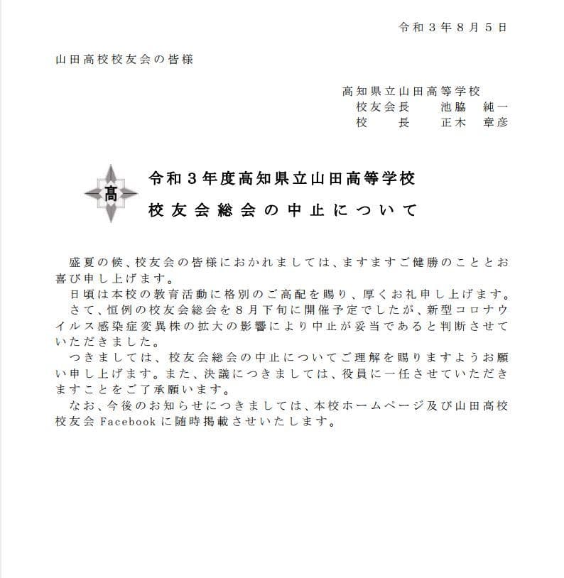 新型コロナウイルス感染症変異株の拡大の影響により、8月下旬開催予定の校友会総会は中止します。12月11日(土)に予定されている創立80周年記念式典開催の有無については10月の段階で決定し、その内容について、本校ホームページ及び山田高校校友会Facebookに掲載させていただきます。