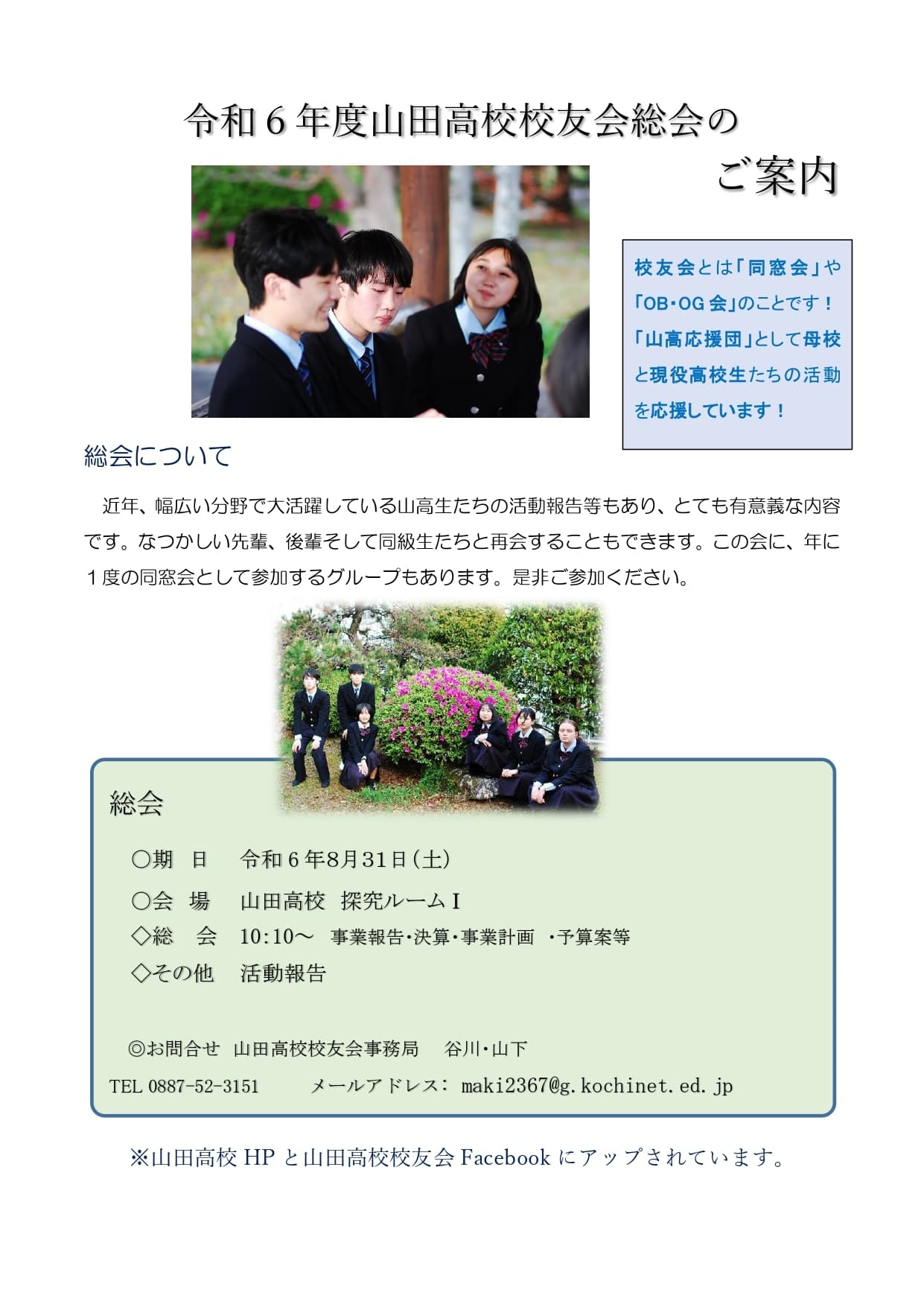 今後の情報につきましては、本校ホームページ及び山田高校校友会Facebookに随時掲載させていただく予定です。なお、寄付金・広告費につきましては、来年度の記念事業に使わせていただきます。