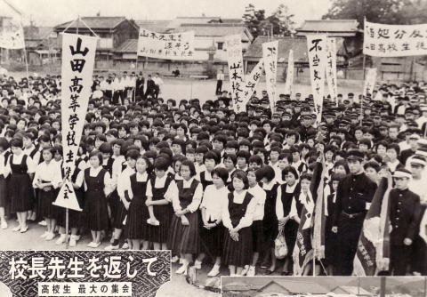 懲戒免職となる。写真は、それに反対する集会の様子。翌年の1月には、新校長拒否の