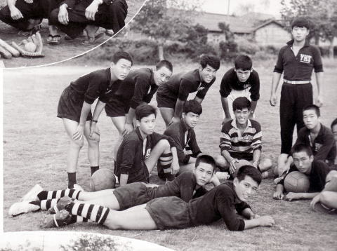 最前列で横たわっているのは、本校卒業生で、漫画家の故はらたいら氏。