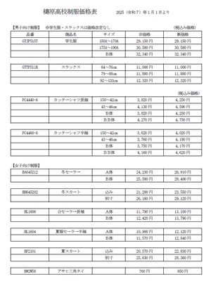 〇制服価格表(クリックすれば拡大します、PDF形式)